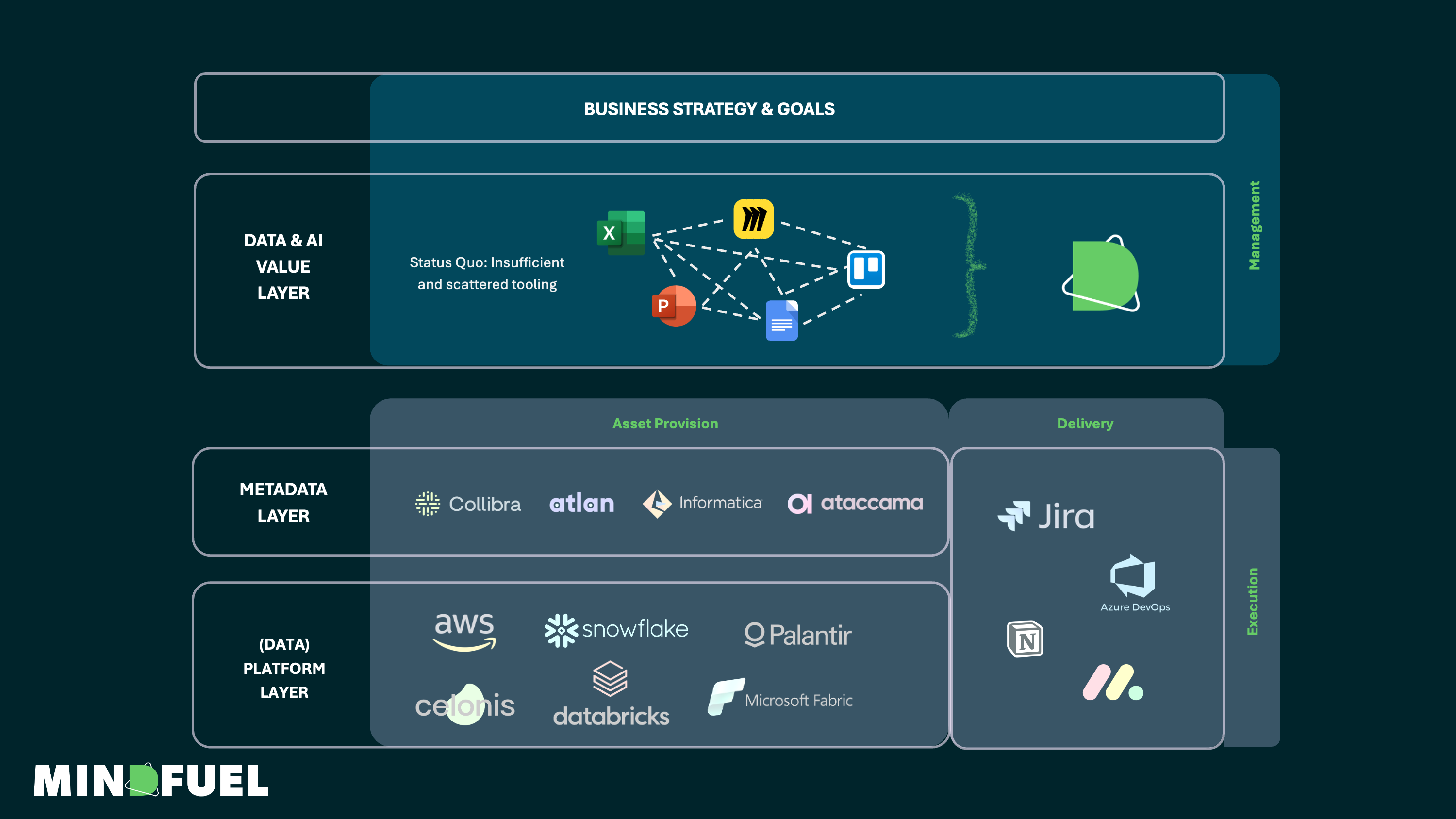 Organizations build platform layers –what’s called the analytical plane – then they add metadata layers on top to keep structure around their data platforms. But here they usually stop. Some of the platform players try to provide what they call an “AI governance layer” on top but that doesn’t solve the problem. Conceptually, they try to jump directly from metadata to business demands, and that gap is where value gets lost.